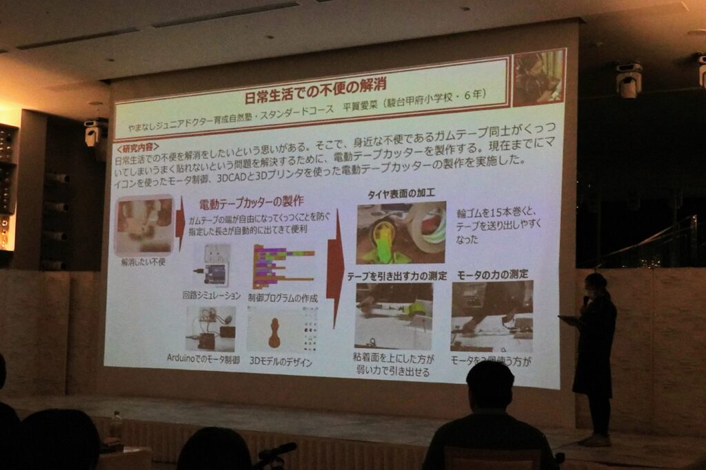 やまなしジュニアドクター育成自然塾からは、アドバンスコースの塾生2名、スタンダードコースの塾生7名が参加し、今年度の研究内容についてそれぞれ発表を行い、スタンダードコースの平賀愛菜さんが奨励賞を受賞しました。