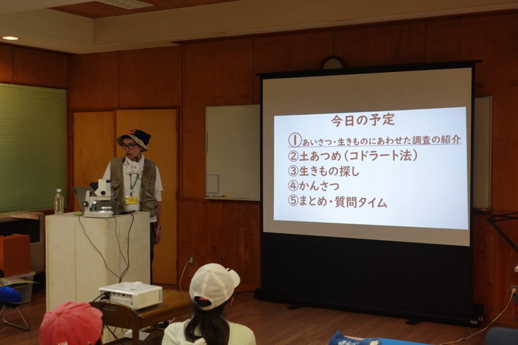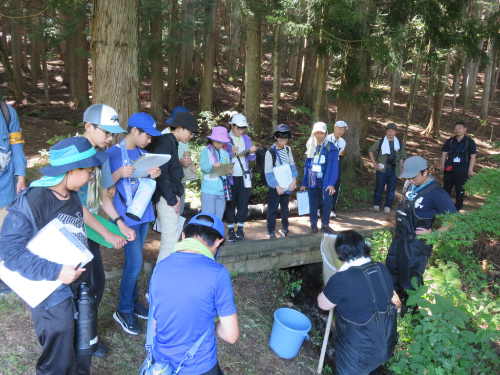 今回は各分野の担当の先生とともに、南アルプス市のユネスコエコパーク内にある伊奈ヶ湖の周辺フィールドワークを行いました。具体的には湖周辺の森に生息するキノコなどの微生物や土壌生物、伊奈ヶ湖に流れ込む小川の水質や生息している水生生物について複数のグループに分かれて調査を行いました。
